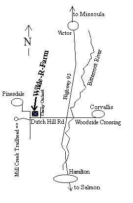 Directions: Wilde-R-Farm is located 42 miles south of Missoula, Montana, between Victor and Hamilton, on the west side of the valley. It is 2.1 miles west of the stop-light at the intersection of Dutch Hill Road - Woodside Crossing - and Highway 93.